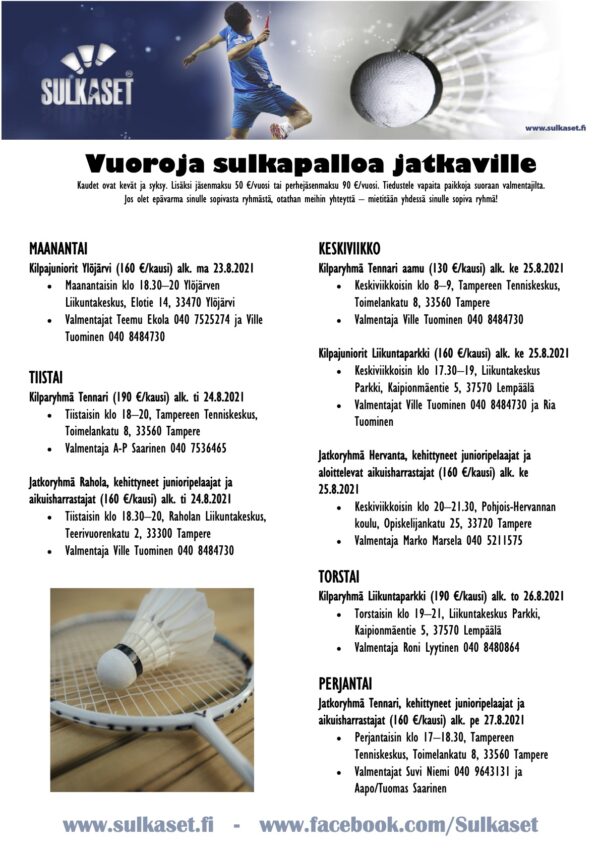 Syksyllä 2021 Sulkaset järjestää seitsemän perusryhmän harjoitusvuoroa, joista neljä on suunnattu junioreille ja kolme aikuisille. Katso tarkemmat tiedot järjestettävistä vuoroista uutisen lopussa olevasta kuvasta ”Vuoroja sulkapalloa aloittaville”.