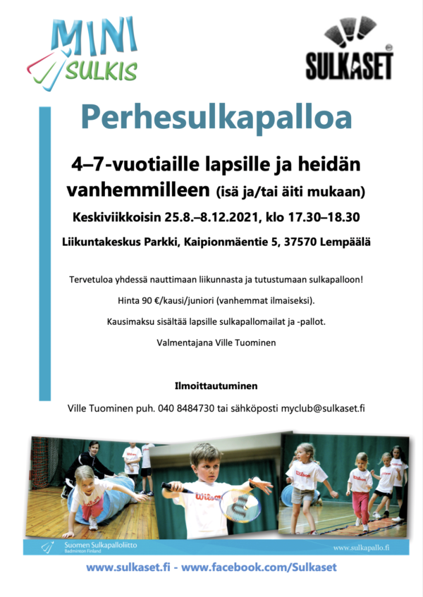 Syksyllä 2021 Sulkaset järjestää yhden perhesulkisvuoron. Katso tarkemmat tiedot vuorosta uutisen lopussa olevasta Minisulkis-kuvasta.