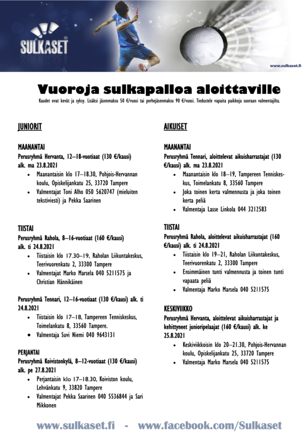Syksyllä 2021 Sulkaset järjestää seitsemän perusryhmän harjoitusvuoroa, joista neljä on suunnattu junioreille ja kolme aikuisille. Katso tarkemmat tiedot järjestettävistä vuoroista uutisen lopussa olevasta kuvasta ”Vuoroja sulkapalloa aloittaville”.